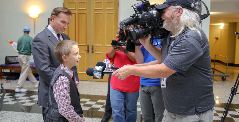 Quickly, Hall and Curry moved to a conference room to speak with the press and sign a formal letter of proclamation officiating him Kid Mayor for the day.